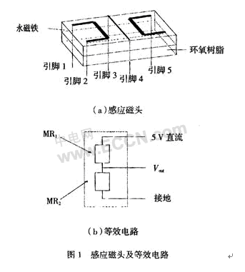 用銻化銦-銦共晶體薄膜磁阻元件制成MRCS的感應(yīng)磁頭(圖1)主要由導(dǎo)線(xiàn)、絕緣基片、InSb-In磁阻元件MR1和MR2、永磁體、5個(gè)引腳等組成,另外加上起屏蔽和保護(hù)作用的金屬外殼。MR1和MR2是相對(duì)放置的一對(duì)磁阻元件,其阻值大致相等,導(dǎo)線(xiàn)置于MR1和MR2的對(duì)稱(chēng)軸位置。其等效電路如圖1(b)。
