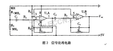 信號(hào)采集電路中的InSb-In薄膜磁阻元件采用三端差分型接法如圖1(b)所示,這種信號(hào)采集電路具有輸出信號(hào)較大和較強(qiáng)抑制溫漂的能力。信號(hào)處理電路采用阻容耦合型差動(dòng)放大電路,在圖2中IC1和IC2為兩級(jí)差動(dòng)放大,改變R2,R7,R5,R8的阻值可以調(diào)整放大倍數(shù)。集成運(yùn)放的靜態(tài)電壓由R3和R6來(lái)調(diào)節(jié),考慮到通常磁頭內(nèi)的上、下兩個(gè)磁阻元件不完全平衡,MR1與MR2的阻值會(huì)有10%以?xún)?nèi)的差別,在+5 V的工作電源下,信號(hào)采集的輸出端電壓在2.4~2.6 V。為了減少信號(hào)在磁頭與運(yùn)放之間阻容耦合中的損失,一般把集成運(yùn)放靜態(tài)電壓設(shè)置為低于2.5 V,取2 V比較合適。