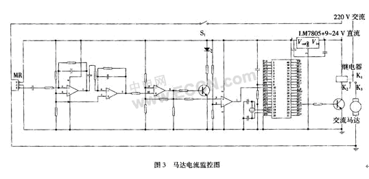圖3中,繼電器的K1和K3為常閉狀態(tài),閉合S1后,馬達(dá)開(kāi)始工作,產(chǎn)生一個(gè)工作電流,使電流傳感器的感應(yīng)磁頭中的MR1和MR2的阻值相應(yīng)變化,從而產(chǎn)生一個(gè)正弦電壓信號(hào);此時(shí)的信號(hào)往往很弱,不足以驅(qū)動(dòng)繼電器,于是經(jīng)過(guò)兩級(jí)放大,變成峰值較大的正弦信號(hào);再經(jīng)過(guò)比較器比較,適當(dāng)調(diào)節(jié)比較器的門(mén)限電壓,令其輸出為低電平,通過(guò)單片機(jī)的編程,使之最后輸出為低電平,此時(shí)繼電器維持常閉狀態(tài),即馬達(dá)正常工作。當(dāng)馬達(dá)突然停轉(zhuǎn),電流遠(yuǎn)大于正常工作的電流,此時(shí)的電流信號(hào)被MRCS感應(yīng),產(chǎn)生的交變電壓信號(hào)經(jīng)過(guò)兩級(jí)放大后,產(chǎn)生一個(gè)峰值為1.6~2.4 V的正弦信號(hào),再經(jīng)過(guò)比較器比較,產(chǎn)生一個(gè)方波信號(hào),進(jìn)入單片機(jī),輸出高電平,驅(qū)動(dòng)繼電器,讓K1和K2閉合并使得K1和K3開(kāi)路便使馬達(dá)斷電,從而達(dá)到保護(hù)馬達(dá)的作用。單片機(jī)的作用是一旦發(fā)現(xiàn)有方波輸入就輸出高電平,無(wú)方波輸入時(shí)輸出低電平,此外,還可以對(duì)單片機(jī)編程,產(chǎn)生適當(dāng)延時(shí),就是當(dāng)馬達(dá)停轉(zhuǎn)時(shí),延時(shí)一小段時(shí)間才輸出高電平,以防止馬達(dá)假死。本實(shí)驗(yàn)采用的單片機(jī)是ATMEL公司的AT89S52,其優(yōu)點(diǎn)是價(jià)格便宜、供貨充足、支持ISP并口編程,使用方便。