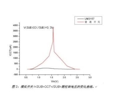 對(duì)于某些開關(guān),電流消耗甚至高達(dá)幾毫安,對(duì)功耗敏感的便攜式設(shè)備而言,這樣的功耗是無法接受的。大多數(shù)標(biāo)準(zhǔn)模擬開關(guān)的產(chǎn)品說明書只給出了典型情況下(即開關(guān)輸入控制信號(hào)的高電平與開關(guān)供電電壓一致)的功耗指標(biāo),這容易讓設(shè)計(jì)工程師感到混淆,他們會(huì)驚奇地發(fā)現(xiàn)在低壓ASIC設(shè)計(jì)中的模擬開關(guān)竟有幾毫安的漏電流。英聯(lián)電子的模擬開關(guān)改善了控制電路的輸入緩沖器,只要芯片的控制輸入電壓大于VIH或小于VIL內(nèi),而不是等于0V或VCC,也能保持非常小的功耗。從圖2可看到采用該技術(shù)的英聯(lián)電子UM3157模擬開關(guān)與普通的同系列模擬開關(guān)在ICCT上的顯著區(qū)別。 [page]
