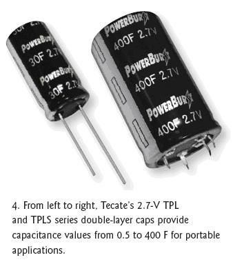 TecateGroup推出了具有多樣配置的多種PowerBurst品牌超級電容器。針對通用的脈沖電源、混合電池和便攜式產(chǎn)品應(yīng)用,徑向引線的TPL和徑向折彎的TPLS系列雙層電容器分別具有0.5F到70F和100F到400F的容量(圖4)。這兩類器件的電壓額定值都是2.7V,工作溫度范圍是-40℃到65℃。TPL和TPLS系列的最大高度分別是45mm(100F)和60mm(400F)。