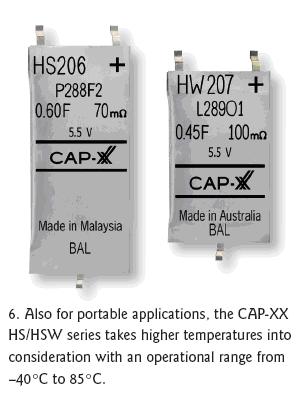 同樣針對緊湊空間設(shè)計但可耐更高溫度的CAP-XX公司HS和HW系列電容器具有很薄的外殼,工作溫度范圍是-40℃到85℃(圖6)。在4.5到5.5V電壓范圍內(nèi),HW的尺寸為28.5x17mm。在5.5V電壓時的電容量可達0.4F,ESR在5.5V時可低至100mΩ。