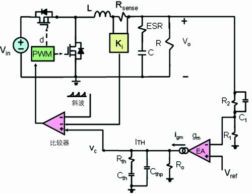電流取樣電阻在輸入端的降壓轉(zhuǎn)換器如圖1所示。在電流模式的降壓轉(zhuǎn)換器拓樸結(jié)構(gòu)中,反饋有兩個(gè)環(huán)路:一個(gè)電壓外環(huán),另一個(gè)是電流內(nèi)環(huán)。電壓外環(huán)包括電壓誤差放大器、反饋電阻分壓器和反饋補(bǔ)償環(huán)節(jié)。電壓誤差放大器的同相端接一個(gè)參考電壓Vref,反饋電阻分壓器連接到電壓誤差放大器反相端VFB,反饋環(huán)節(jié)連接到VFB和電壓誤差放大器的輸出端VC。若電壓型放大器是跨導(dǎo)型放大器,則反饋環(huán)節(jié)連接到電壓誤差放大器的輸出端VITH和地。目前,在高頻DC/DC的應(yīng)用中,跨導(dǎo)型放大器應(yīng)用更多。本文就以跨導(dǎo)型放大器進(jìn)行討論。輸出電壓微小的變化反映到VFB引腳,VFB引腳電壓與參考電壓的差值被跨導(dǎo)型放大器放大,然后輸出,輸出值為VITH。跨導(dǎo)型放大器輸出連接到電流比較器的同相端,電流比較器的反相端輸入信號(hào)為電流檢測(cè)電阻的電壓信號(hào)VSENSE。由此可見(jiàn),對(duì)于電流比較器,電壓外環(huán)的輸出信號(hào)作為電流內(nèi)環(huán)的給定信號(hào)。對(duì)于峰值電流模式,工作原理如下:在時(shí)鐘同步信號(hào)到來(lái)時(shí),高端的主開(kāi)關(guān)管開(kāi)通,電感激磁,電流線性上升,電流檢測(cè)電阻的電壓信號(hào)也線性上升。由于此時(shí)電壓外環(huán)的輸出電壓信號(hào)高于電流檢測(cè)電阻的電壓,電流比較器輸出為高電壓;當(dāng)電流檢測(cè)電阻的電壓信號(hào)繼續(xù)上升,直到等于電壓外環(huán)的輸出電壓信號(hào)時(shí),電流比較器輸出翻轉(zhuǎn),從高電平翻轉(zhuǎn)為低電平,邏輯控制電路工作,關(guān)斷高端主開(kāi)關(guān)管的驅(qū)動(dòng)信號(hào),高端的主開(kāi)關(guān)管關(guān)斷,此時(shí)電感開(kāi)始去磁,電流線性下降,到下一個(gè)開(kāi)關(guān)周期開(kāi)始的時(shí)鐘同步信號(hào)到來(lái),如此反復(fù)。
