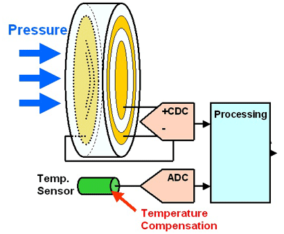 由于熱擴(kuò)散,溫度傳感器需要考慮改變的幾何形狀。設(shè)想兩個(gè)電極中的一個(gè)附著在芯片上,另一個(gè)附著在由金屬或陶瓷構(gòu)成的支架上,因此支架自己作為傳感器。以陶瓷為例,能夠承受非常高的壓力和侵入的媒介。與經(jīng)典的惠斯通電橋相比較,電容壓力傳感器的主要優(yōu)點(diǎn)是對(duì)輸入電流的要求更低,使得他們特別適合于諸如輪胎壓力控制之類的應(yīng)用。