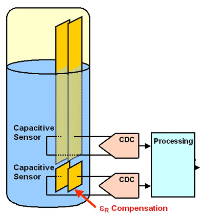 在一個(gè)液位傳感器中,一對(duì)固定的導(dǎo)板浸沒在要測量的液體中。制造商能夠以非常低的成本制造出印制導(dǎo)體。第二對(duì)導(dǎo)板附著在底部,可以檢測出由于溫度或其他影響導(dǎo)致的電介質(zhì)變化,如下圖所示。