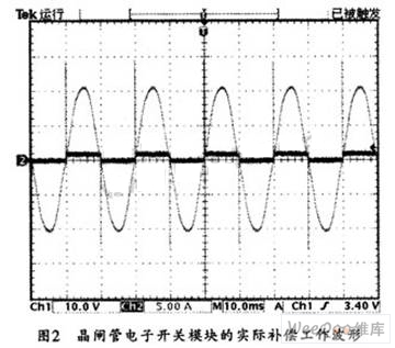 在無(wú)功補(bǔ)償實(shí)際應(yīng)用中,可將晶閘管電子開(kāi)關(guān)模塊用在TSC低壓無(wú)功補(bǔ)償以替代接觸器,這樣,就可以在開(kāi)關(guān)電壓過(guò)零時(shí)投入補(bǔ)償電容量,從而避免了沖擊電流的產(chǎn)生和瞬間電網(wǎng)電壓的波動(dòng)。圖2所示是其工作波形圖。