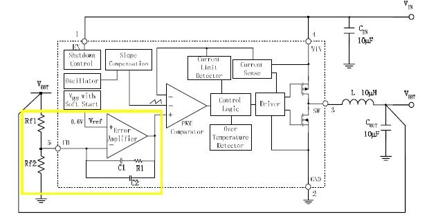 對(duì)于不同廠商設(shè)計(jì)的Buck變換器芯片,外圍電路所需要的器件會(huì)有所不同,這是因?yàn)樾酒募啥扔胁町?,比如,有的廠商會(huì)把功率管集成在芯片內(nèi)部;有的廠商會(huì)把控制部分的補(bǔ)償網(wǎng)絡(luò)集成在芯片內(nèi)部。集成度越高的芯片,外圍電路所需要的器件就越少,因此對(duì)于客戶來說,外圍器件的選擇需要根據(jù)具體芯片來決定。然而,對(duì)于任何一個(gè)輸出可以調(diào)節(jié)的Buck變換器芯片,選擇合適的反饋電阻是必不可少的。圖2是BCD半導(dǎo)體公司的Buck變換器AP3406的典型應(yīng)用圖,由于該芯片集成度很高,外圍只需要輸入電容、輸出電感、輸出電容和反饋電阻,本文就以此為例對(duì)反饋電阻的作用做簡要分析,為如何選擇反饋電阻提供參考。