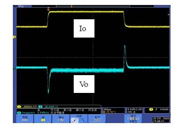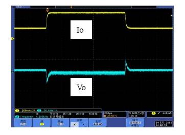 系統(tǒng)的帶寬是影響系統(tǒng)動(dòng)態(tài)響應(yīng)的重要因素,相位裕度是影響系統(tǒng)穩(wěn)定性的重要因素。如果選擇不同的Rf1,系統(tǒng)的帶寬和相位裕度會(huì)產(chǎn)生變化,也就是動(dòng)態(tài)響應(yīng)和穩(wěn)定性會(huì)發(fā)生變化。具體以表1來分析,當(dāng)Rf1從300k變到750k,系統(tǒng)地帶寬從51.1kHz變到26.1kHz,因此系統(tǒng)的動(dòng)態(tài)響應(yīng)會(huì)相應(yīng)的變差,而由于相位裕度都是足夠的,因此系統(tǒng)都處于穩(wěn)定工作的狀態(tài)。圖7和圖8是做負(fù)載切換的動(dòng)態(tài)響應(yīng)測(cè)試結(jié)果,從測(cè)試結(jié)果可以看出環(huán)路響應(yīng)速度變慢,導(dǎo)致輸出電壓過沖變大,動(dòng)態(tài)響應(yīng)效果變差。
