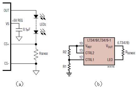 調(diào)節(jié)LED的電流最簡單的方法就是改變和LED負(fù)載串聯(lián)的電流檢測電阻(圖2a),幾乎所有DC-DC恒流芯片都有一個檢測電流的接口,是檢測到的電壓和芯片內(nèi)部的參考電壓比較,來控制電流的恒定。但是這個檢測電阻的值通常很小,只有零點幾歐,如果要在墻上裝一個零點幾歐的電位器來調(diào)節(jié)電流是不大可能的,因為引線電阻也會有零點幾歐了。所以有些芯片提供一個控制電壓接口,改變輸入的控制電壓就可以改變其輸出恒流值。例如凌特公司的LT3478(圖2b)只要改變R1和R2的比值,也可以改變其輸出的恒流值。