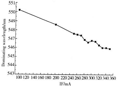 當(dāng)正向電流為350mA時,主波長為545.8nm;當(dāng)正向電流減小為200mA時,主波長為548.6nm;當(dāng)正向電流減小為100mA時,主波長為550.2nm。