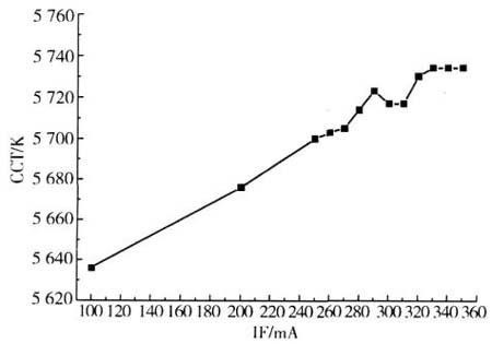 由圖4可知,當(dāng)正向電流為350mA時,色溫為5734K,而正向電流增加到350mA時,色溫就偏移到5636K。電流再進一步減小時,色溫會向暖色變化。