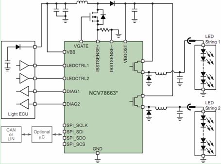 安森美半導體針對LED汽車前照燈系統(tǒng)開發(fā)了NCV78663電源鎮(zhèn)流器及雙LED驅動器。NCV78663是先進的高可靠性、高能效的系統(tǒng)級芯片(SoC) LED驅動器,支持達2 A電流,提供高于90%的總能效,驅動高達60 V電壓的多串LED,能以PWM調光維持色溫及控制平均電流,使設計人員能夠以一顆高集成度的SoC控制遠光燈及近光燈、日間行車燈、轉向指示燈及霧燈,所需外部元件極少。這器件通過SPI接口與外部微控制器通信,在上電后動態(tài)地控制系統(tǒng)參數(shù)、檢測LED工作狀態(tài)并反饋診斷信息。圖4顯示的是NCV78663在先進的汽車前照燈應用中的電路圖。