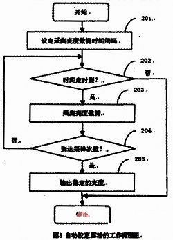 亮度感應(yīng)自動(dòng)控制的自動(dòng)校正算法的步驟:首先設(shè)定采集亮度數(shù)據(jù)的時(shí)間間隔以及設(shè)定采樣次數(shù);當(dāng)時(shí)間間隔定時(shí)到時(shí),讀取光感應(yīng)器亮度的數(shù)據(jù);當(dāng)采樣次數(shù)到達(dá)預(yù)設(shè)次數(shù)后,輸出穩(wěn)定的亮度;再由CPU輸出穩(wěn)定的PWM,去控制液晶面板的背光。設(shè)定采集亮度數(shù)據(jù)時(shí)間間隔201是初始化每次采集光感應(yīng)器亮度的時(shí)間。時(shí)間定時(shí)到202是達(dá)到可以去采集光感應(yīng)器亮度的時(shí)間。采集亮度數(shù)據(jù)203是CPU讀取光感應(yīng)器亮度數(shù)據(jù)通過ADC的數(shù)字信號(hào)的數(shù)值。到達(dá)采樣次數(shù)204是到達(dá)采集亮度數(shù)據(jù)都一樣的次數(shù),表示環(huán)境亮度已經(jīng)穩(wěn)定,不再變化。輸出穩(wěn)定的亮度205是CPU輸出穩(wěn)定的PWM去控制液晶面板的背光。如圖3亮度感應(yīng)自動(dòng)控制的自動(dòng)校正算法的工作流程所示。