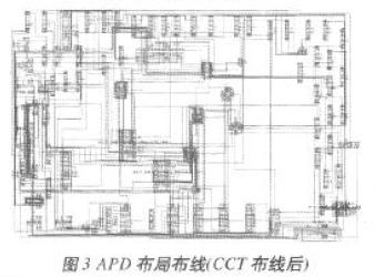 如上所述,MCM布局布線的實(shí)現(xiàn)包括電路原理圖生成、擴(kuò)充零件庫(kù)及最終的布局布線完成和加工數(shù)據(jù)文件輸出。APD Layout包括Padstack(*.pad)、Package Symbol(*.psm)、Mechanical Symbol(*.bsm)、Format Symbol (*.osm)和Shape Symbol(*.ssm)五種,MCM布局布線設(shè)計(jì)中,所有的布局都必須有正確的Library Packing。MCM設(shè)計(jì)軟件自帶封裝庫(kù)往往不能滿(mǎn)足具體設(shè)計(jì)要求,只有擴(kuò)充零件庫(kù)后,才能直接調(diào)用零件進(jìn)行布局布線設(shè)計(jì)及最終的工藝文件輸出。首先利用Padstack Editor軟件擴(kuò)充零件庫(kù),然后對(duì)電路進(jìn)行封裝,并通過(guò)Concept HDL給APD軟件導(dǎo)出電連接網(wǎng)表文件,最后完成電路布局布線。以檢測(cè)器電路為例,其原理圖主要部分如圖2所示,圖3為CCT(Spectra)布線后的形式。整個(gè)設(shè)計(jì)中,定義了16個(gè)Padstack和81個(gè)封裝符號(hào),進(jìn)行251次調(diào)用Padstack和89次調(diào)用功能單元,其中共用到了251個(gè)元件封裝符號(hào)引腳和229個(gè)功能單元引腳。