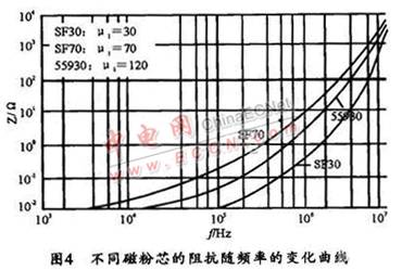 當(dāng)頻率在100 kHz~1 MHz頻段時,鐵氧體材料Z急增,而金屬磁性材料和超微晶仍然平穩(wěn)上升,在1 MHzl/寸,進口鐵氧體達到峰值,Z最大,說明在這一頻段內(nèi),鐵氧體材料對干擾噪聲的抑制效果最好。所以,制造共模濾波器時所選用的電感材料一定要根據(jù)電路要求的抑制頻段范圍來選擇,這是非常重要的。同時,從表1與圖3所示曲線對比可以看出,并不是電感量越高越好,而應(yīng)考慮它的電參數(shù),更不能簡單用增加線圈匝數(shù)的方法來增加電感,因為這樣會增加高頻寄生電容。