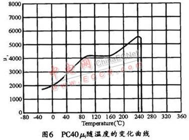 中小功率的EMI濾波器產(chǎn)品中選用最多的磁芯材料是日本TDK公司 的PC40 (它是目前業(yè)界廣泛使用的較好的材料之一),它的初始磁導(dǎo)μi隨溫度的變化曲線如圖6所示。從圖中可看出,溫度變化對μi的影響是很大的,磁芯溫度在 90~150℃的區(qū)間內(nèi),有一段平坦區(qū),這時它的μi大約在4100左右;當(dāng)溫度低于90℃后,μi值會隨著溫度的降低而逐漸減小,到0℃時,μi值只有 2000左右,進到負溫區(qū)后,μi值還會進一步減小;而當(dāng)溫度高于150℃后,μi值則會隨著溫度的升高而增加,當(dāng)達到240℃時,μ的最大值為5600 左右;從240℃開始,μi值又漸漸減小,當(dāng)溫度達到居里溫度點250℃時,材料失去磁性。