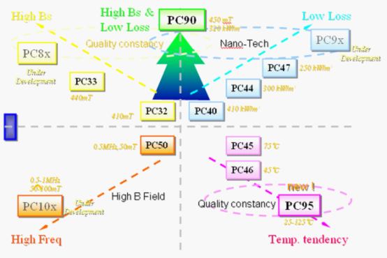 - PC47有更高的飽和磁通密度和更低的損耗