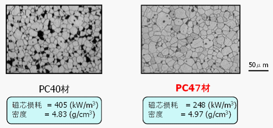 至于高性能材質(zhì)的研發(fā),設計的原理,材質(zhì)研發(fā)出來,它的密度更大。拿PC40材和PC47材兩個材質(zhì)高倍放大鏡成像的對比,可以發(fā)現(xiàn)左邊PC40材質(zhì)有很多黑色的點。那些點是間隙,粒子之間存在很多間隙。右邊PC47材質(zhì)黑點比PC40材小,也就是說PC47材密度會遠遠大于PC40材質(zhì),從而降低磁芯損耗,提高變換效率,降低發(fā)熱。基于材料開發(fā)及燒制因素(燒制方法、溫度條件)的最適度,實現(xiàn)材料的高密度設計。