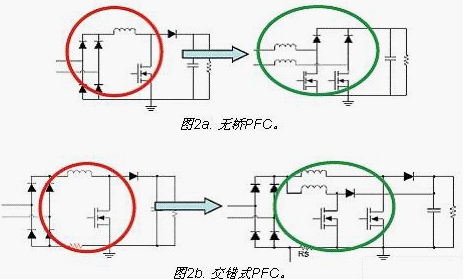 改善PFC能效的目標(biāo)是為了實(shí)現(xiàn)功率因數(shù)校正短的效率達(dá)到96%以上。采用無(wú)橋PFC(圖2a)可以減少橋損耗,采用交錯(cuò)式PFC(圖2b)可以滿足較高功率應(yīng)用的要求,以提升PFC能效。此外,還可以利用IC技術(shù)減少開關(guān)損耗,并利用更優(yōu)化的拓?fù)浣Y(jié)構(gòu)來(lái)減少EMI濾波器損耗。