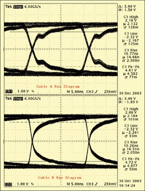 圖4是實際應(yīng)用的眼圖情況,很明顯電纜B的眼圖要比電纜A的眼圖要好,和前面的仿真結(jié)果比較吻合,不過電纜A的實際反射比較大一點,這和仿真使用驅(qū)動器件的模型有關(guān)。