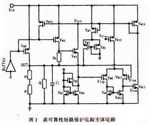 在限流電路的基礎(chǔ)上,設(shè)計(jì)改進(jìn)一個(gè)短路保護(hù)電路,確保在短路情況下,徹底關(guān)斷功率MOS管,減少短路發(fā)生時(shí)系統(tǒng)損失的功耗。同時(shí)該電路具有以下特點(diǎn):高可靠性、自動(dòng)恢復(fù),即使地平面存在大量噪聲,當(dāng)短路發(fā)生時(shí),穩(wěn)壓器的功率管截止,實(shí)現(xiàn)保護(hù),而短路一旦消除,穩(wěn)壓器的輸出將自動(dòng)恢復(fù)到正常狀態(tài),有效地保護(hù)系統(tǒng)。在藍(lán)牙功率放大器電源管理電路中得到了很好應(yīng)用。