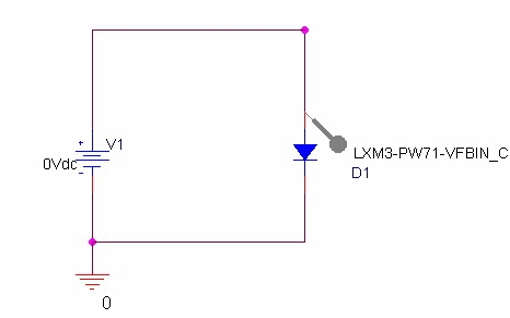 我們用電路仿真來說明LED的電子特性以及驅(qū)動電路。電路仿真是對LED和電阻等的電子設(shè)計進行建模并在計算機上模擬計算電路運行的一種簡易方法。這里使用的是Cadence公司的電路仿真PSpice A/D。同時使用了飛利浦照明公司的LUXEON系列LX3-PW71。