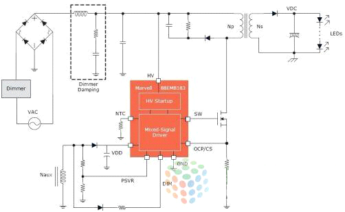 消費(fèi)者用LED節(jié)能燈取代白熾燈等傳統(tǒng)照明解決方案的同時(shí),也希望得到同樣或更好的照明體驗(yàn)。不幸的是,他們常常發(fā)現(xiàn)LED燈在調(diào)光能力上有問題,因此覺得LED燈幾乎不能調(diào)光或調(diào)光時(shí)會(huì)閃爍。很多LED燈與家中已安裝的壁式調(diào)光器也不兼容。Marvell最新的88EM8183深度調(diào)光單級交流/直流 LED驅(qū)動(dòng)器IC為OEM廠商和ODM廠商提供了兼容性最廣泛的調(diào)光解決方案,該IC與全球市場上絕大多數(shù)調(diào)光器都兼容,而且提供卓越的光輸出質(zhì)量,可提高消費(fèi)者的滿意度,減少退貨。