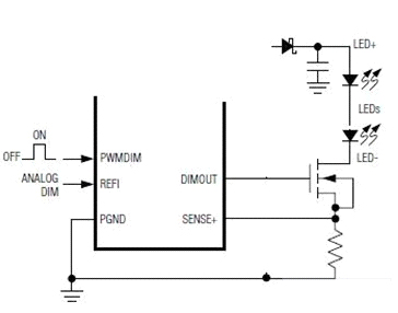然后用一個(gè)PWM信號加到MOS管的柵極,以快速地開關(guān)這串LED。從而實(shí)現(xiàn)調(diào)光。也有不少恒流芯片本身就帶一個(gè)PWM的接口,可以直接接受PWM信號,再輸出控制MOS開關(guān)管。