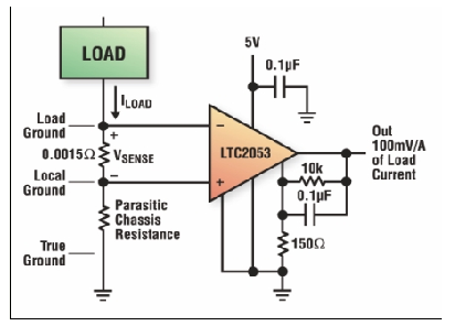 乍看起來,將一只電阻器與地串聯起來似乎與最直接的電流檢測方案很相似。這種技術就是眾所周知的低端電流檢測(圖3A),該技術要求沒有接地路徑存在,因為接地路徑會對檢測電阻器周邊的電流分流,或者說會使相鄰電路貢獻電流。特別是當機械外殼是系統地的話,要串聯進一只檢測電阻器將是不實際的。同樣,由于地并非良導體,系統中不同點的接地電壓會不一致,從而在精密測量中需要采用一個差分放大器(圖3B)。