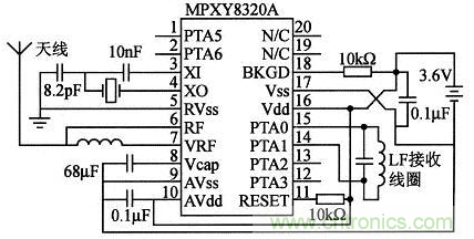 檢測(cè)模塊由胎壓測(cè)量專用高集成芯片MPXY8320A微控制器和電源組成,檢測(cè)模塊電路原理如圖4所示。MPXY8320A工作在DC 2.1~3.6 V,具有低功耗的效能以延長(zhǎng)電池壽命。MPXY8320A最大的特點(diǎn)是,其內(nèi)部集成了8位MCU、適應(yīng)載重型輪胎的壓力傳感器、溫度傳感器、供電電源電壓監(jiān)測(cè)、X-Z軸上的加速度傳感器以及RF發(fā)送模塊,所以MPXY8320A是一款專為交通工具胎壓測(cè)量而設(shè)計(jì)的高集成芯片。由于器件的高集成度,在體積上、功耗上、電磁兼容性方面都有很出色的表現(xiàn)。