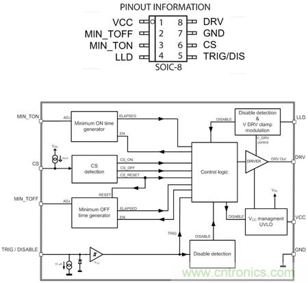 NCP4305可采用SOIC-8、DFN8和WDFN8三種封裝。MIN_TOFF 和MIN_TON引腳通過連接電阻到地,調(diào)節(jié)最小關(guān)斷和最小導(dǎo)通時間。LLD引腳用于在輕載時調(diào)節(jié)驅(qū)動器鉗位電平,或關(guān)斷驅(qū)動器。DRV引腳是同步整流MOSFET的驅(qū)動器輸出。CS(電流采樣檢測)引腳用于檢測電流是否流過同步整流MOSFET。TRIG/DIS引腳提供超快關(guān)斷輸入,用作在CCM應(yīng)用中關(guān)斷同步整流MOSFET以提升能效,當上拉超過100 us時激活禁用模式。