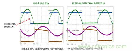 在CCM應(yīng)用中,當初級端MOS管導(dǎo)通時,通過隔離驅(qū)動器強制使次級端MOS管關(guān)斷;當初級端MOS管關(guān)斷, TRIG腳功能使次級端MOS管導(dǎo)通。這種交替導(dǎo)通特性大大提高系統(tǒng)能效。如圖5所示,無觸發(fā)功能的初級端和次級端驅(qū)動信號交疊的時間為40 ns,遠大于帶觸發(fā)功能的12 ns,也就是說,觸發(fā)功能將縮短延遲時間,從而降低損耗。