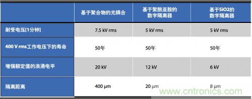 安全標(biāo)準(zhǔn)通常規(guī)定1分鐘耐壓額定值(典型值2.5 kV rms至5 kV rms)和工作電壓(典型值125 V rms至400 V rms)。某些標(biāo)準(zhǔn)也會(huì)規(guī)定更短的持續(xù)時(shí)間、電壓浪涌(如10 kV峰值并持續(xù)50 µs)作為增強(qiáng)絕緣認(rèn)證的一部分要求。聚合物/聚酰亞胺隔離器可提供最好的隔離特性(見(jiàn)表1)。聚酰亞胺數(shù)字隔離器與光耦合器類似,在典型工作電壓下,工作壽命超過(guò)電機(jī),額定使用壽命為50年。SiO2隔離器的工作壽命與之接近,但是,對(duì)高能浪涌的保護(hù)能力卻較弱。