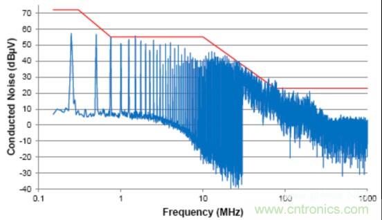由于信號(hào)的共模部分能夠與系統(tǒng)(或與外部系統(tǒng))中的其它分量耦合在一起(通過輻射或傳導(dǎo)路徑),這個(gè)共模噪聲直接影響放射性能。這個(gè)器件的傳導(dǎo)放射按照工業(yè)電氣工程/電子 (IBEE) 茨維考技術(shù)的工程服務(wù)進(jìn)行測(cè)量;如圖2中所示,這個(gè)器件的傳導(dǎo)放射連同一個(gè)普通汽車原始設(shè)備制造商(OEM)限值線一同繪制。