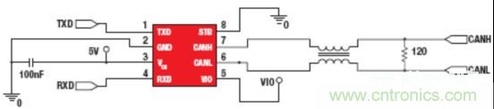 此外,當(dāng)CANH和CANL線路在顯性和隱性狀態(tài)之間變換時(shí),它們之間的變換時(shí)間和定時(shí)偏移需要良好匹配,以限制出現(xiàn)在高頻頻帶內(nèi)的共模噪聲。