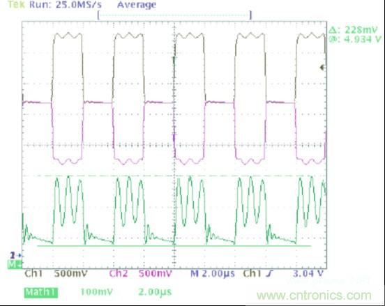 圖1中的波形顯示了一個(gè)可以在典型CAN收發(fā)器的輸出上觀察到的共模噪聲。在這幅圖像中,黑色軌跡線(通道1)顯示CANH,紫色軌跡線(通道 2)顯示的是CANL,并且綠色軌跡線(數(shù)據(jù)功能)是CANH與CANL的和。這個(gè)求和的過程給出了一個(gè)波形,它的值等于此時(shí)一個(gè)指定點(diǎn)上共模電壓的2 倍。