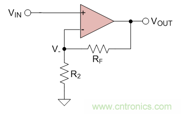 等式中A_CL是閉環(huán)增益,R_F 是反饋電阻值,而R_2 是從負(fù)輸入端到信號(反相)或接地(非反相)的電阻值。