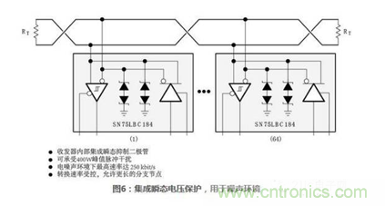 電流隔離能夠提供更好的系統(tǒng)級(jí)保護(hù),但是價(jià)格也更高。更流行并且比較便宜的方案是使用二極管保護(hù)。使用二極管方法代替電流隔離是一種折衷方法,在更低層次上提供保護(hù)。外接二極管和內(nèi)部集成瞬態(tài)保護(hù)二極管的例子如下圖所示:圖5所示485收發(fā)器SN75LBC176外接二極管來(lái)防止瞬態(tài)毛刺。