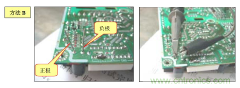 B. 方法(2):在電源板的錫面找出待測電容正負極對應的焊點,焊上兩根導線,然后用電壓探頭夾住引出的導線測試.如下圖: