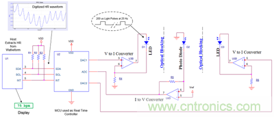 如圖2所示,在一個(gè)光電心率系統(tǒng)設(shè)計(jì)中,難以實(shí)現(xiàn)和成本很高的功能模塊分別是:快速的、大電流的驅(qū)動(dòng)LED的電壓到電流轉(zhuǎn)換器,用于光電管的電流到電壓轉(zhuǎn)換器,以及運(yùn)行算法和對(duì)序列信號(hào)進(jìn)行處理的MCU。一個(gè)可被設(shè)置到低至2mA的很低電流,但同時(shí)仍然能產(chǎn)生短至10µs的非常窄的光脈沖低噪聲(75 - 100 dB SNR)300mA LED驅(qū)動(dòng)器也是一個(gè)用分離器件實(shí)現(xiàn)起來(lái)非常昂貴的模塊。