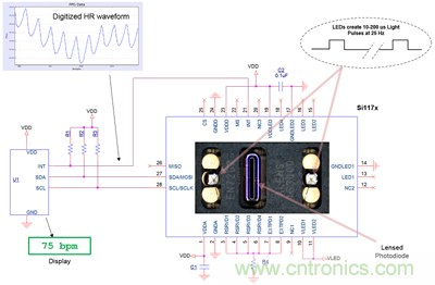圖3. 一個(gè)只需要外部LED的集成化心率傳感器