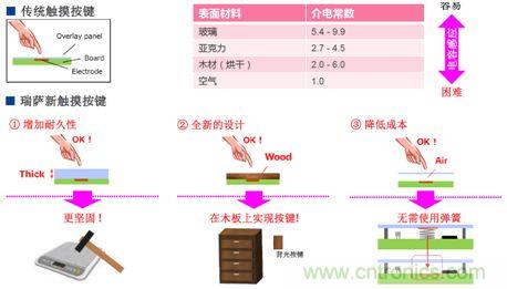 相對于傳統(tǒng)觸摸按鍵,新的觸摸功能按鍵可以透過10mm厚度的亞克力材料或者木板進行感應(yīng),具有更加堅固的耐久性,無需使用觸摸感應(yīng)彈簧。它與輕觸按鍵相比,耐久性增強,并且具有抗污防水能力,可以大大降低按鍵的錯誤率。