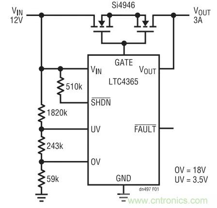 圖 1 示出了一款完整的應用電路。一個阻性分壓器負責設定用于負載與 VIN 連接 / 斷接的過壓(OV)和欠壓 (UV) 跳變點。如果輸入電源漂移至該電壓窗口之外,則 LTC4365 將迅速把負載與電源斷接。