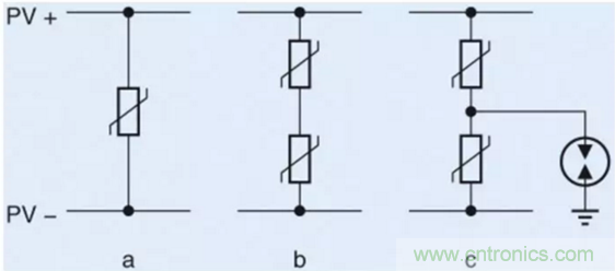 額定電壓為1000 V DC的金屬氧化物壓敏電阻通常用于太陽能逆變器的直流輸入。根據(jù)待處理線路電壓,例如電壓為300 VRMS的壓敏電阻可以是變頻器輸出的首選。在這兩種情況下,也可使用充氣式氣體放電管以實現(xiàn)額外防護。圖2為太陽能逆變器直流輸入的常用電路設(shè)計:最簡化版本(圖2a)僅使用一個額定電壓為1000 VRMS的壓敏電阻(例如片狀,直徑20毫米)。在這種情況下,額定直流電壓為1414 V DC,而鉗位電壓在100 A時為2970 V。圖2b所示電路通過串聯(lián)的兩個壓敏電阻運作,兩元件應(yīng)專用于550 VRMS (745 V DC),以提供相同保護。這一設(shè)計提供了一大優(yōu)點:鉗位電壓在電流為100 A時僅為2710 V,從而進一步抑制過電壓。此外,待吸收能量將平均分布于兩個組件,從而降低負荷系數(shù)。圖2c所示電路則在壓敏電阻與地面之間添加了一個氣體放電管。這一設(shè)計仍將提供充分保護,特別是當單個或兩個壓敏電阻出現(xiàn)故障或因負荷導(dǎo)致老化時。必須使用氣體放電管,以免當兩個壓敏電阻同時故障時進入持續(xù)導(dǎo)電狀態(tài)。