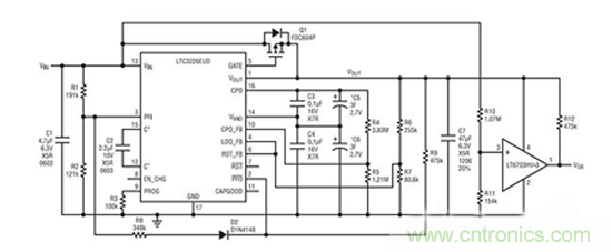 電容器具有緊湊、堅(jiān)固和可靠的特點(diǎn),并能支持用于應(yīng)對短期掉電過程中后備系統(tǒng)的電源要求。與電池相似,它們也需要在輸出端進(jìn)行謹(jǐn)慎的充電和功率調(diào)節(jié)。LTC®3226 是一款具有一個電源通路 (PowerPath™) 控制器的兩節(jié)串聯(lián)超級電容器充電器,可簡化后備系統(tǒng)的設(shè)計(jì)。特別地,該器件包含一個具可編程輸出電壓和自動電池電壓平衡功能的充電泵超級電容器充電器、一個低壓差穩(wěn)壓器和一個用于實(shí)現(xiàn)正常模式與后備模式之間切換的電源故障比較器。低輸入噪聲、低靜態(tài)電流和緊湊的占板面積使 LTC3226成為緊湊、手持和電池供電型應(yīng)用的理想選擇。這款器件采用3mm x 3mm 16引腳QFN封裝。