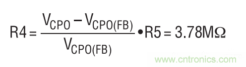 串聯(lián)連接的超級電容器上的滿充電電壓被設(shè)定為5V。這是利用位于 CPO 引腳與 CPO_FB 引腳之間的一個分壓器網(wǎng)絡(luò)完成的。R5 設(shè)定為 1.21M,并計(jì)算 R4阻值。VCPO(FB)為1.21V。