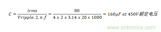 如果僅需要電容器來控制電動(dòng)汽車動(dòng)力系統(tǒng)等直流線路上的紋波電壓,則在選擇電容器時(shí)將會(huì)呈現(xiàn)顯著不同。 總線電壓可能與以前一樣為400V,但由采用電池供電,因此不存在穿越需求。在下游轉(zhuǎn)換器以20kHz的開關(guān)頻率提取80Arms脈沖電流時(shí),將紋波限制在4Vrms以內(nèi)是非?,F(xiàn)實(shí)的, 所需的電容是: