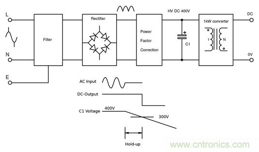 例如,對(duì)于用作1kW離線轉(zhuǎn)換器的大容量電容,通過比較電解電容器和薄膜電容器可以清楚地說明這兩種類型電容器之間的特性差異。 如圖1所示,該轉(zhuǎn)換器具有功率因數(shù)校正前端,且具有400V的標(biāo)稱直流總線電壓(Vn)。