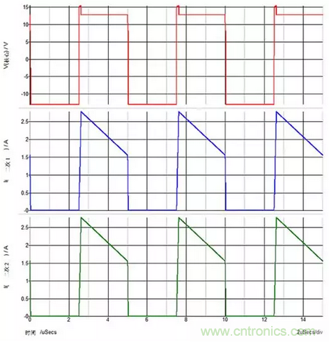 圖3:重載次級(jí)1和輕載次級(jí)2?;妷簩?duì)次級(jí)2的輸出電容器進(jìn)行峰值充電。