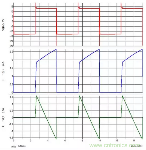 圖2:當(dāng)對(duì)兩個(gè)輸出施加重載時(shí),在整個(gè)1-D周期內(nèi),次級(jí)繞組電流在兩個(gè)次級(jí)繞組中流動(dòng)。您可以看到上方紅色跡線上的基座電壓。